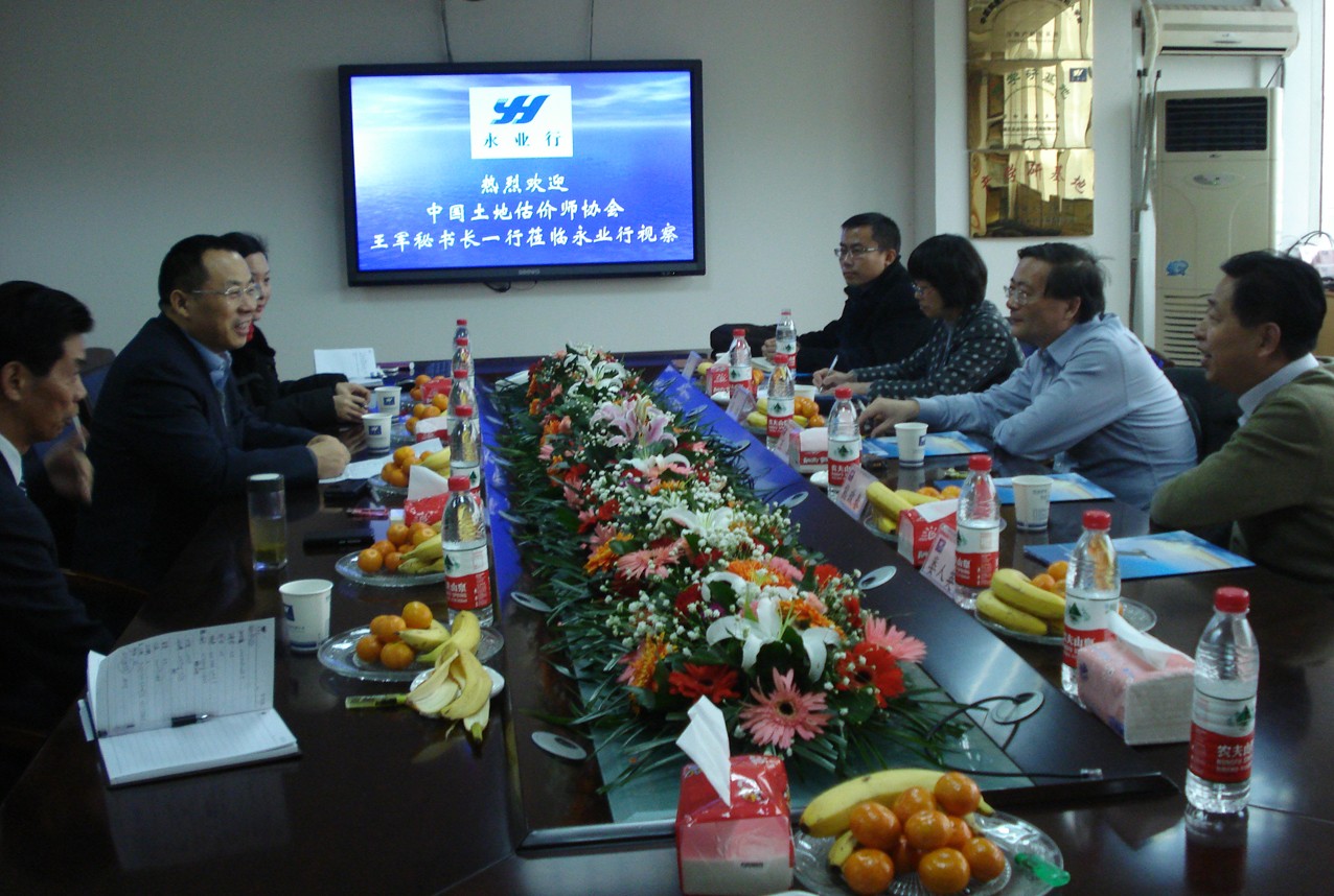 2013年12月15日,中国土地估价师协会王军秘书长一行莅临永业行考察 2013-12-15 12月15日,中国土地估价师协会秘书长王军,副秘书长沈飞、张洁一行3人莅临永业行考察,湖北省土地估价师协会(简称“省估协”)会长熊政春陪同考察。 公司董事长方国成,总裁潘世炳,综合部负责人杨雪莲,房地产评估一部负责人宣娟娟、技术部助理总经理肖莉热情接待了王秘书长一行。永业行专题片展播后,董事长方国成介绍了公司发展现状、未来发展方向及战略部署;总裁潘世炳详细介绍了公司2013年度财务状况、发展思路、区域发展布局、技术管理措施及办公软件系统建设,交流了估价机构在多元化发展方面的探索和经验等。王军秘书长对永业行取得的成绩和发展前景予以充分肯定,并就土地估价机 MORE