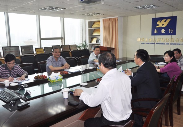1月15日,武汉市移民局副局长黄华、综合处处长田雁等一行4人莅临永业行指导工作。 永业行董事长方国成、副总裁肖锋、研究部总经理江洁等对黄局长一行表示热烈欢迎。副总裁肖锋带领黄局长等参观了永业行的办公场所,并介绍了永业行的发展历程、近期业绩、发展规模、行业地位、长远目标等情况;研究部高级经理吴品涵就双方合作的南水北调移民稳定风险评估研究课题作了成果汇报;黄局长对永业行的良好发展态势表示赞赏,对永业行课题组的工作给予了充分的肯定,并希望今后双方继续加强交流和合作。此外,他还结合课题研究成果提出了一些宝贵的建议。 永业行研究部副总经理吴学锋、唐佳林,高级经理张徽,经理冉超等也参与